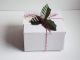Pack of 10 white high Gloss Gift/favour boxes with hinged lid (10cm x 10cm x 5cm) with Red bakers twine, gift tags & artificial holly leaves with berries