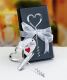 Elegant and functional corkscrew with a stylish heart cut-out shape. The corkscrew measure 13cm x 5cm and is made of sturdy chrome. The chrome corkscrew is beautifully packaged in a clear box with a black bottom, elegantly finished with a white organza bow and designer heart shaped thank you tag attached.