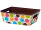 Large size Chocolate Designer Dots Market Trays measuring 7" x 9" at the top, 5" x 7-1/2" at the bottom and 3-1/2" deep presentation. These versatile containers are made from heavy paperboard stock and work for gourmet gift baskets, food baskets.