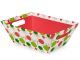 Hip Holiday design Xmas gift boxes measuring 25cm length x 19cm width x 9cm deep. These versatile containers are made from heavy paperboard stock and work for gourmet gift baskets, food baskets or even as a home decor decorative accessory. Open top beveled containers have cut-out handles and are printed on all sides